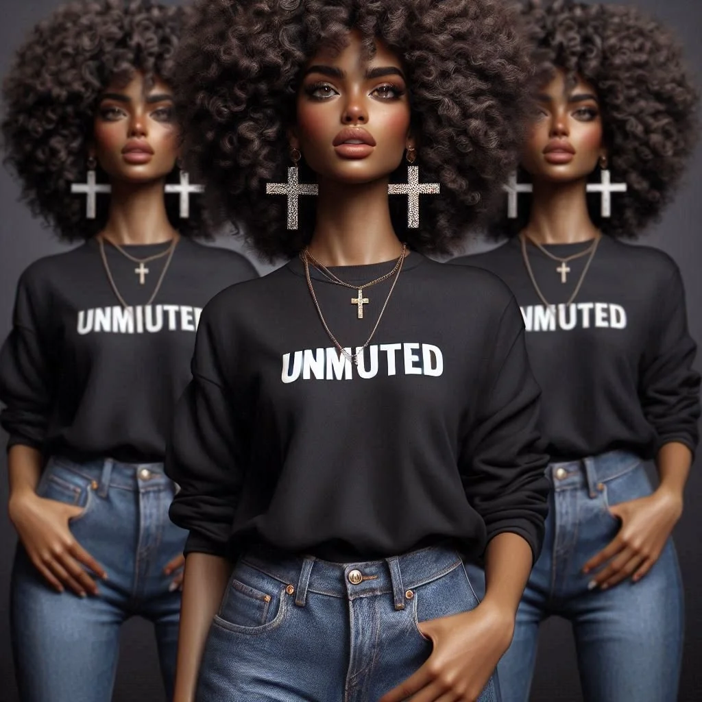 Three women with large curly hair, wearing black sweatshirts with the word 'UNMUTED' in white, blue jeans, and large cross earrings and necklaces, standing against a gray background.
